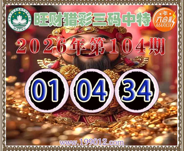 104期:《旺财猎彩》 ♠️三码中特♠️【01.04.34】开:01